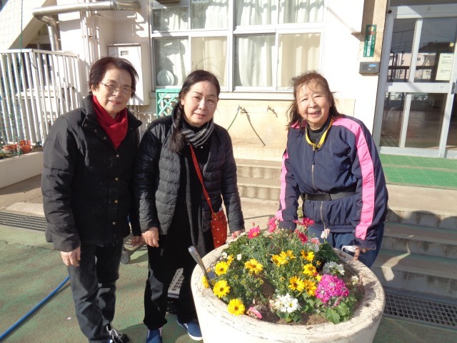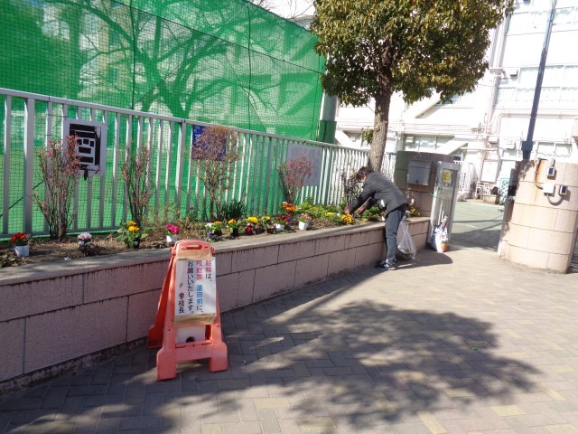 学校応援団のグリーンボランティアの方3名が、正門前と正門を入ったところに、たくさんのお花を植えてくださいました。
