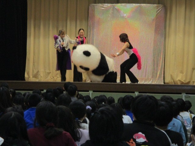 全校児童の前で、「チームウィズ」の皆様がマジックショーを披露してくれました。