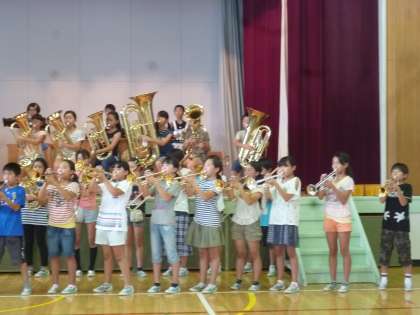 7月17日(金)の始業式後、5・6年生有志の金管バンドが退場曲を演奏しました。曲目はビートルズの「オブラディオブラダ」です。60名を超えるメンバーの迫力ある演奏に、下級生たちは憧れの眼差しで見ていました。今年度、金管バンドクラブは老人ホームでの演奏会、管楽器発表会の参加など新しい試みにもチャレンジします。今後も練習を重ね、さらなる上達を目指していきます。