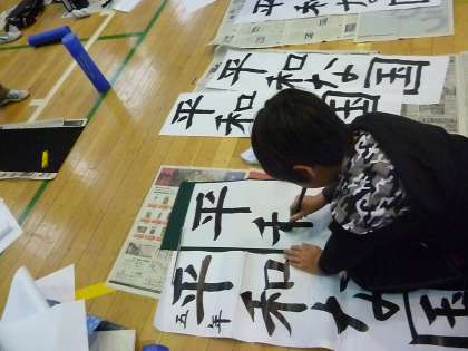 寒空の中、1月12日(火)体育館で書き初め大会が行われました。5年生は「平和な国」にチャレンジしました。はじめに、丁寧に書くポイントや字のバランスなどを確認しました。冬休みに練習したこともあり、どの子も上達が見られました。心を落ち着けて、2016年の良いスタートを切ることができました。