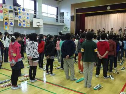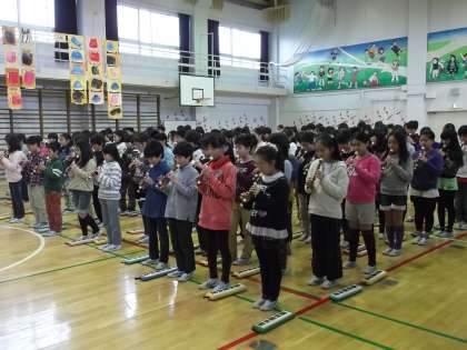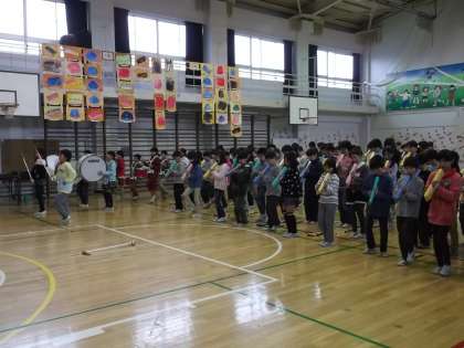 鼓笛の練習成果をお家の方に発表しました。曲目は、鼓笛「ミッキーマウスマーチ」「グリーングリーン」、鍵盤「銀河鉄道999」、リコーダー「威風堂々」「蛍の光」、合唱「心の中にきらめいて」です。来週からは、5年生が朝会後に鼓笛を演奏します。二小の伝統を引き継ぐため張り切っています。練習の成果が発揮できるといいです。