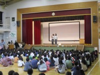 前後左右の人との距離を広く空けることを意識して、立ち位置の確認をしました。また、腕を大きく伸ばすことも気をつけて踊りました。