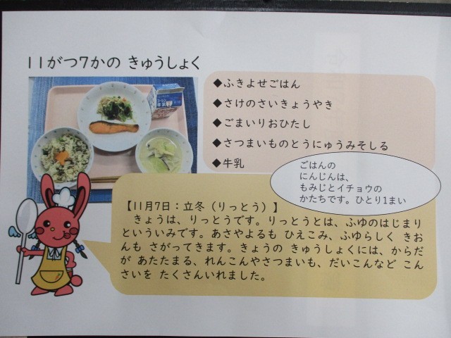11月7日(金)今日の給食は、・ふきよせご飯・鮭の西京焼き・ごま入りおひたし・さ...