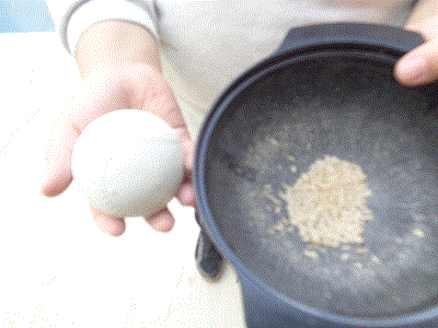 脱穀した籾をボールに入れ、ソフトボールでゴリゴリと摺ってもみ殻を外していきます。