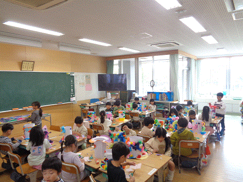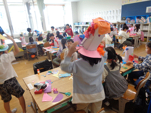 1年生が、図工の授業で、自分だけの帽子を作っていました。