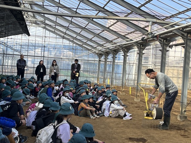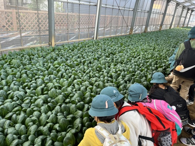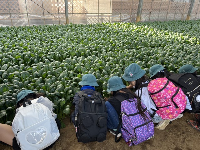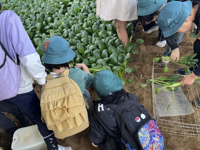 子どもたちが小松菜を収穫させていただきました。なかなか抜けない小松菜に、奮闘する姿も。収穫した小松菜は、明日の給食でいただけるそうです。