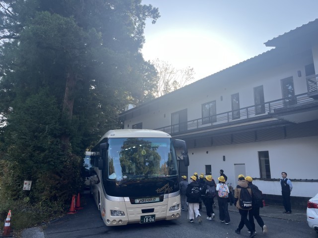 お弁当を受け取り、湯元までバスで移動します。紅葉が見頃を迎えていて、気持ちの良い朝です。