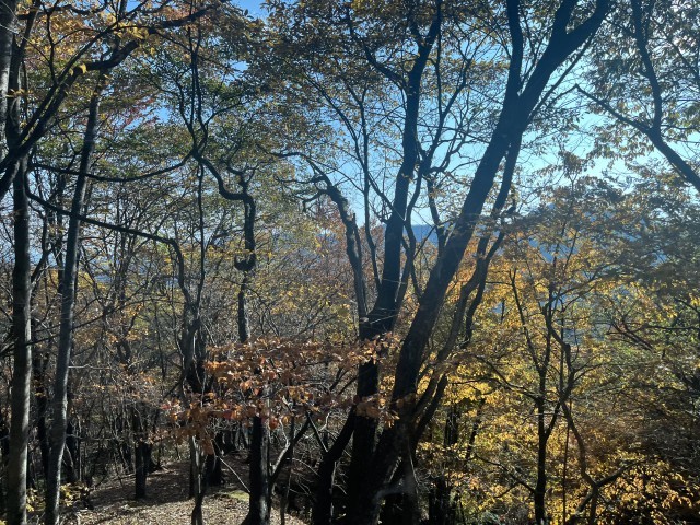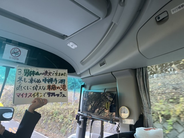 いろは坂を上がっています。説明が上手なガイドさんの下、美しく色付いている紅葉の景色を味わいながら、ゲームに励んでいます。20ものカーブに耐えるべく、しおりを頭の上に乗せている姿がありました。