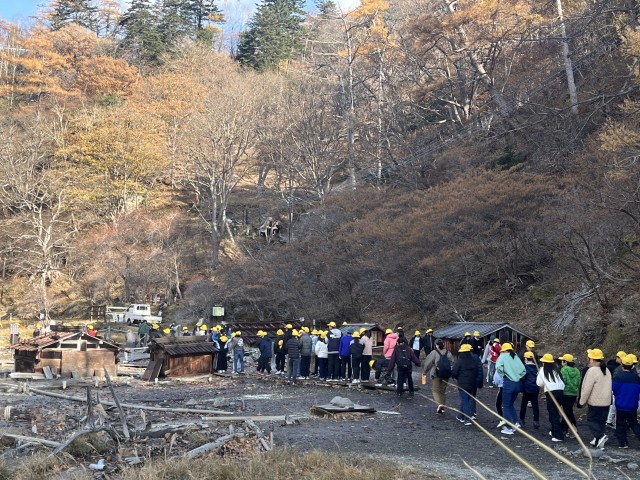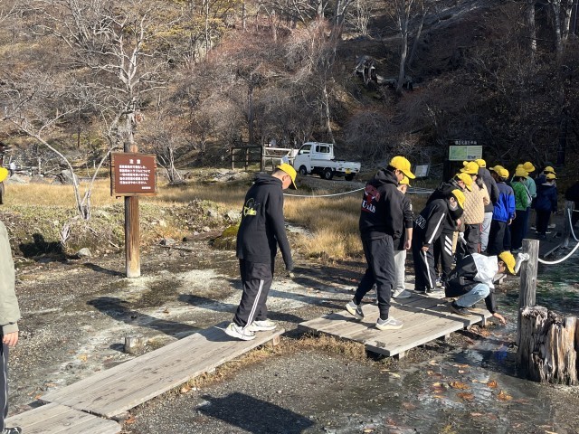源泉を散策しました。硫黄の匂いにびっくりしている子が多かったです。水たまりに手を入れて、その温かさに温泉のありがたさを感じている子もいました。