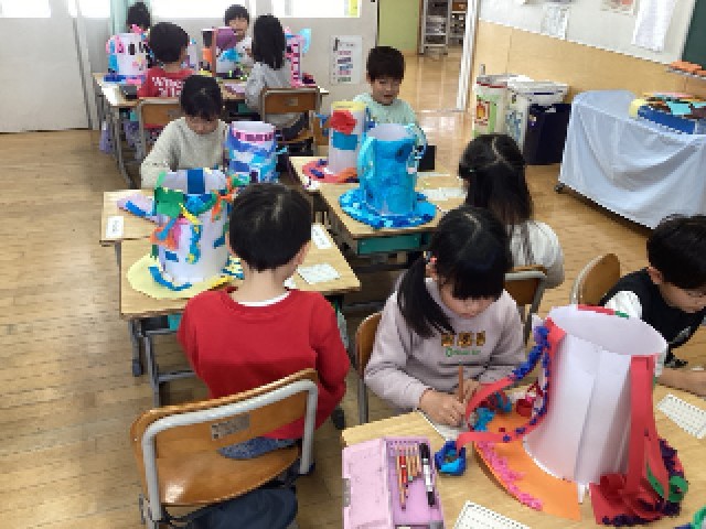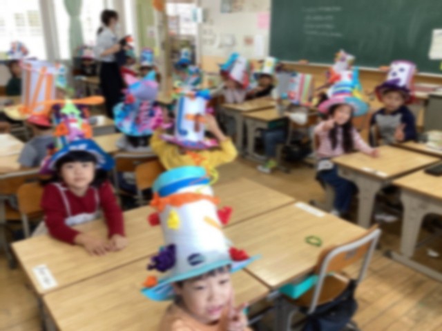 1年生の「すてきなぼうし」が完成し、みんなでお披露目をしていました。