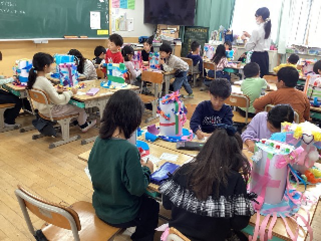自分の作品の、気に入っているところや努力して作ったところを振り返った後、友達の作品の素敵だと思ったところを伝え合いました。
