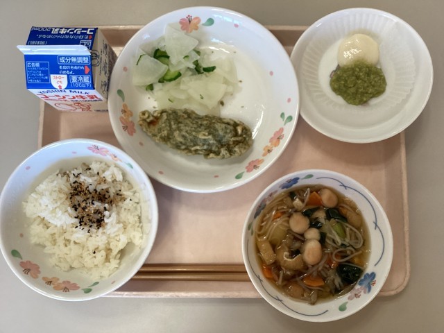 今日の献立は、ごまごはん、笹かまと鶏ひき肉の磯辺揚げ、大根の浅漬け、おくずかけ、ずんだもち、牛乳です。
