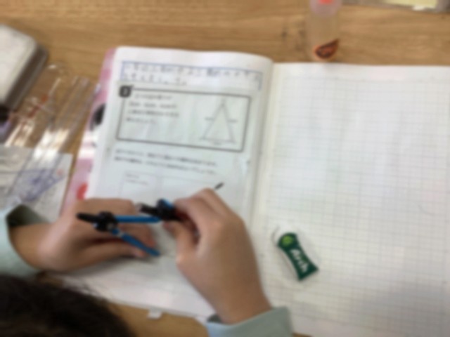 底辺とした3㎝の直線の端を頂点として、そこから4㎝の長さに測ったコンパスでしるしを付け、しるしが交わったところを頂点として直線を引き、正確な三角形を作図していました。