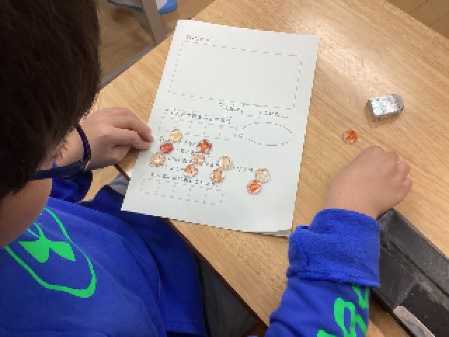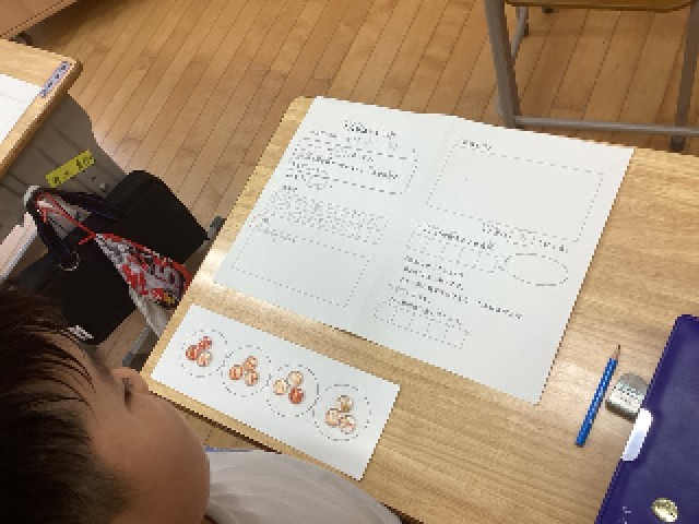 おはじきや、お皿に見立てたヒントシートなど、それぞれに必要なツールを使って、12こを4人に分けていく作業をする際、