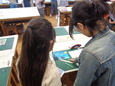 クラスを半分に分けて、鑑賞するお客様と、案内する学芸員になりきって、小さな展覧会を楽しみました。