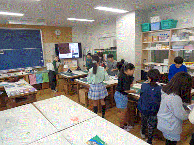 音覧会では学芸員として活躍した5年生が、授業の中でお互いの作品を鑑賞し、自分の作品について紹介する活動をしていました。