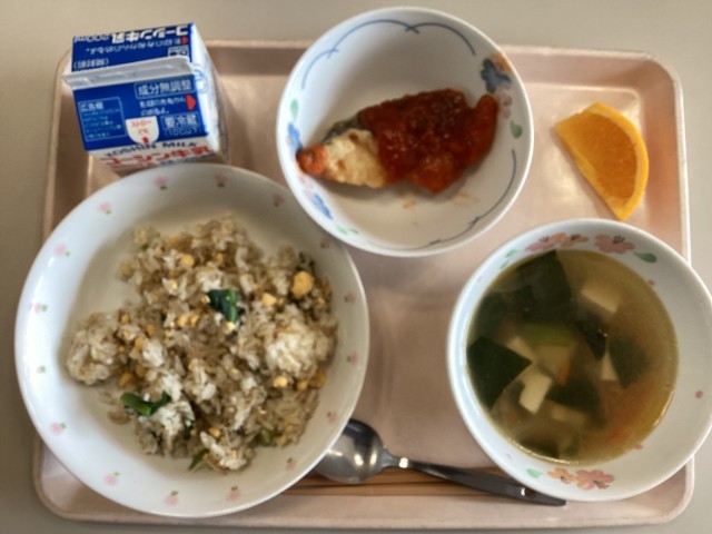 今日の献立は、じゃこチャーハン、タラのチリソース、ビーフンスープ、オレンジ、牛乳です。