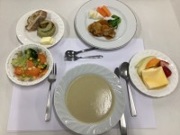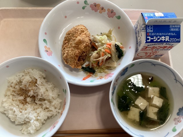 今日の献立は、麦ご飯、大豆コロッケ、レンコンのサラダ、きのこのおろし汁、牛乳です。