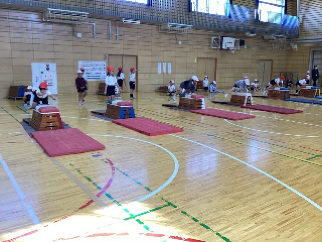 まずは、両足で飛び越す練習や、タイミングよく跳び箱の上に乗る練習をしています。