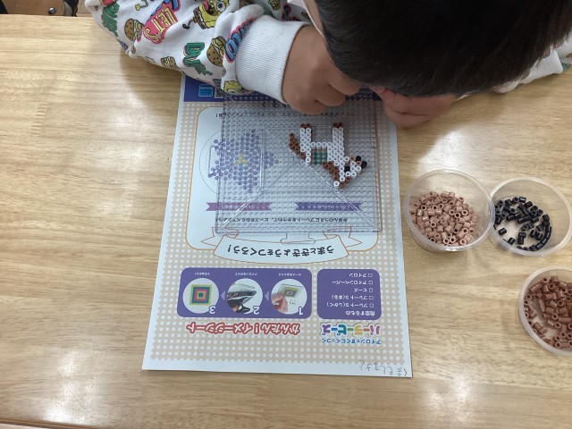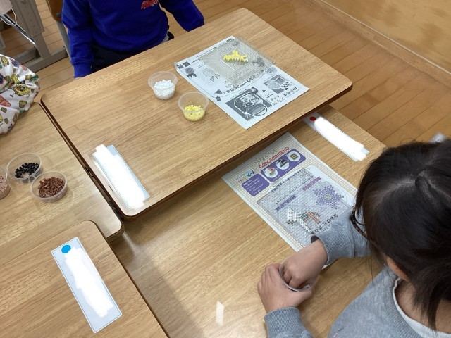 連合展覧会に向けて、低学年の児童がアイロンビーズの作品に取り組んでいます。