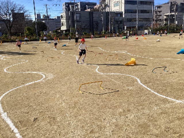 自分たちで、ミニハードルやコーンの置き方を工夫し、ジグザグに走ったり、続けて跳んだりする動きを組み合わせていました。