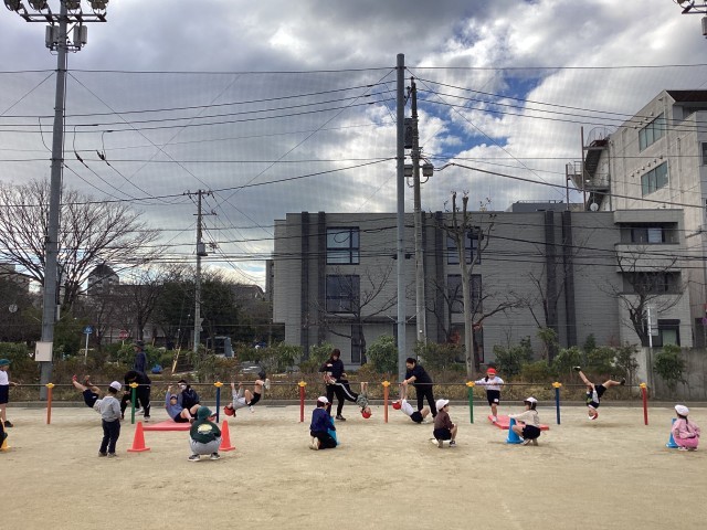 日中お日様が見えると、暖かさを感じるのですが、午前中は寒さと戦いながら、鉄棒に取り組みました。