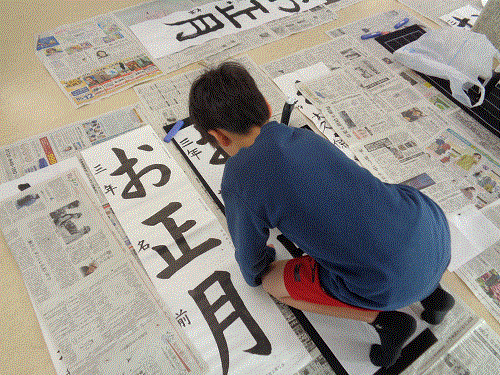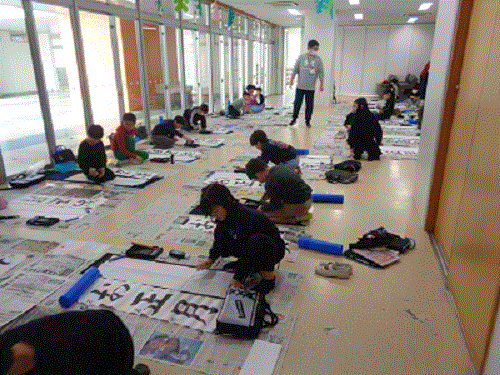 大きな書き初め用の紙一杯に、堂々とした文字を書く子どもたち。