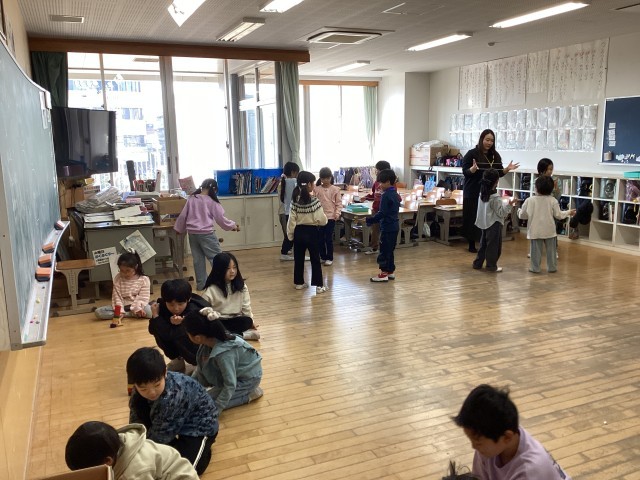 生活科で、「むかし遊び」を学習しています。お手玉、だるま落とし、けん玉、こま回し、あやとり、おはじきなど、大人にとって懐かしい遊びに、子どもたちは夢中になって取り組んでいます。