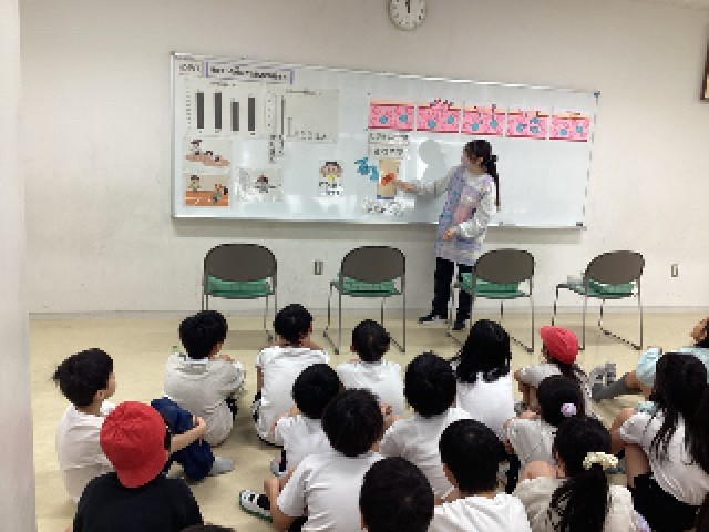 「すりきずができたときに、水で洗うと、けがはどうなるかな。治ると思いますか?」と聞かれた子どもたち。少し悩んでいます。