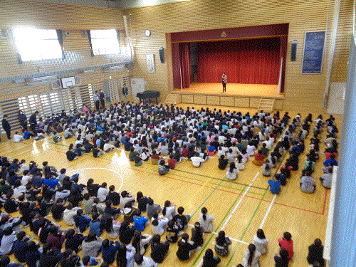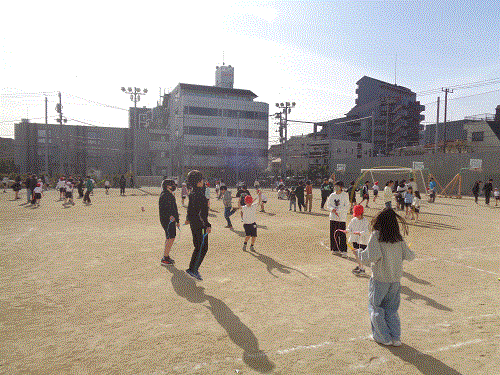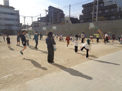 なかよし班のペア学年で、昼休みに短なわに取り組みます。
