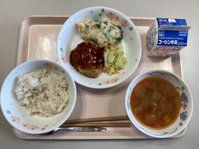 今日の献立は、ご飯、すずきのハンバーグ、ボイルキャベツ添え、3色ポテト、トマトスープ、牛乳です。