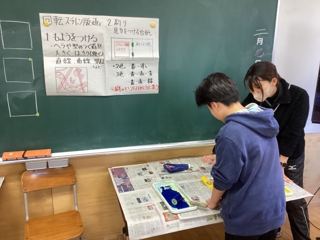 高学年の児童が「回転スチレン版画」に取り組んでいます。模様をつけた後、「刷り」に挑戦です。2色にするのか、3色にするのか、先生と悩みながら、進めています。