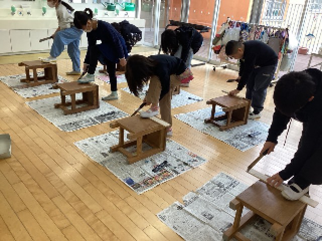4年生は、ノコギリで板を好きな形に切って、つなげて作品を作る学習をしていました。