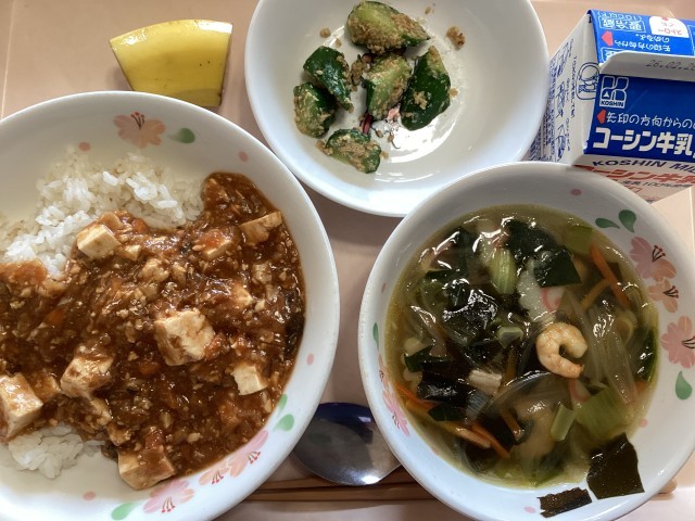 今日の献立は、減塩マーボー丼、春雨スープ、きゅうりごま、バナナ、牛乳です。