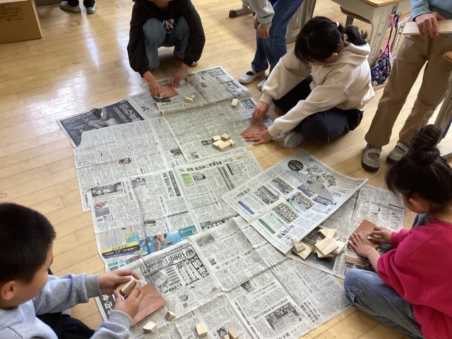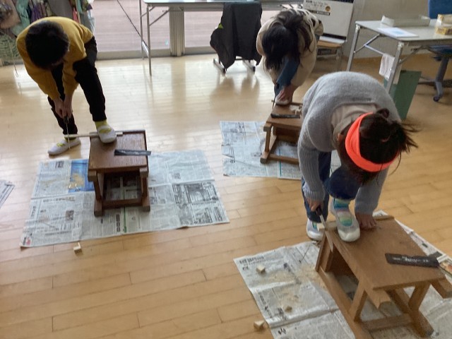 廊下からギコギコと、ノコギリの音が聞こえてきました。ノコギリを持っている子どもたちは、真剣そのもの。