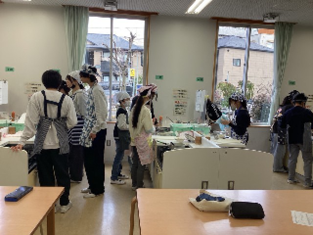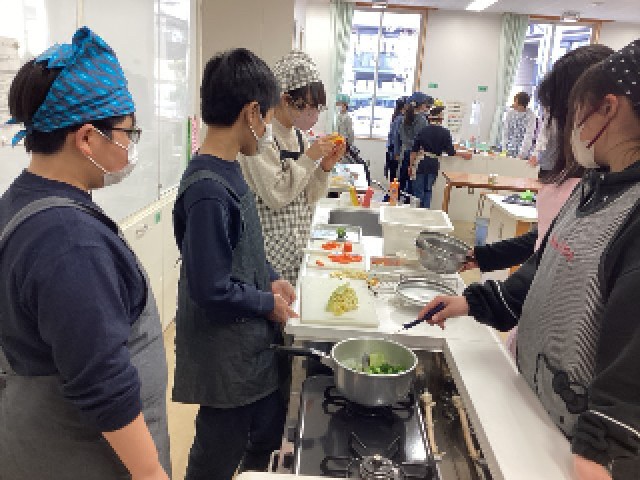 調理は班で協力・分担しています。とても楽しそうですね。ぜひ、お家でも作ってみてほしいと思います。