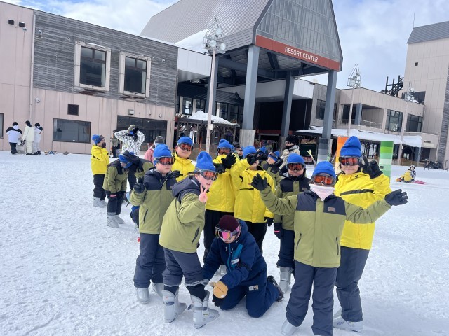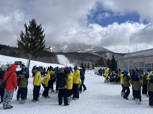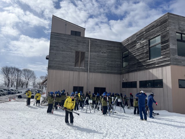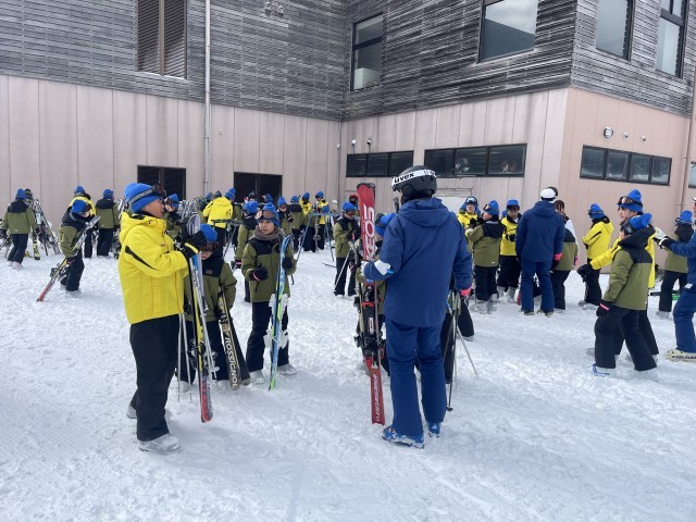 いよいよ始まります。スキー靴の履き方のおさらい、板の付け方から丁寧に教わっています。