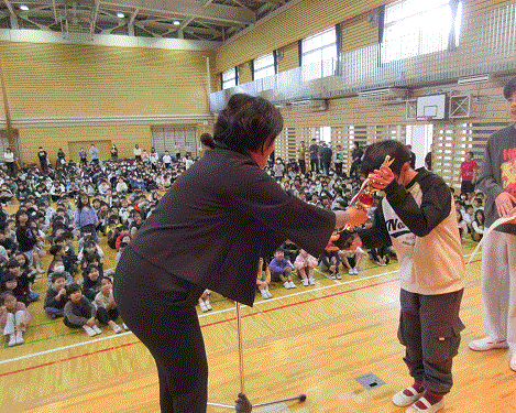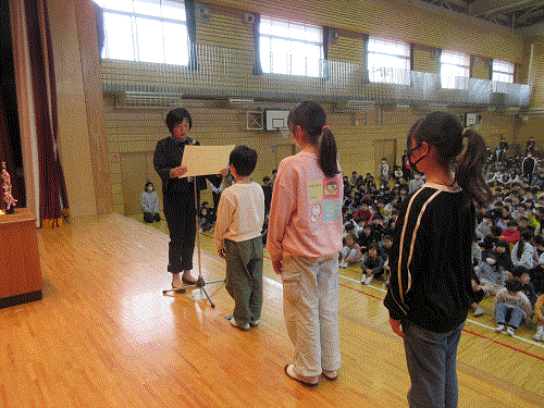 書き初めで優秀な成績だった子、地域のドッチビー大会で上位に入ったチームの代表の子の表彰をしました。