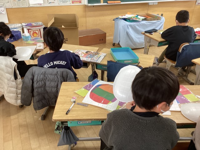 「かぶって、変身!お面を作ろう」の学習の下、子どもたちはお面づくりに夢中になっています。