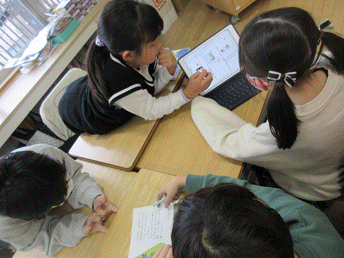 タブレットに送られた道具の写真を、グループで相談しながら、年代別に並べ替えています。