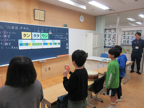「タン(四分音符)」「タタ(八分音符)」「ウン(四分休符)」の4拍分の組み合わせを、一人一人の子どもが考えて、それを組み合わせ、みんなで演奏する活動をしました。
