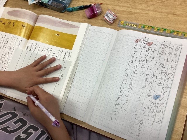 2年生では、「スーホの白い馬」を学習しています。スーホと白馬の心のつながりを本文から読み取り、この時間の締めは、スーホの日記を書きます。子どもたちは、スーホにしっかり感情移入して、日記を書いていました。