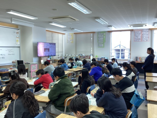 外国語の授業では、リスニングのテストを行なっていました。3つの例文のどれが、イラストに当てはまるのかを、子どもたちは注意深く聞き取る姿がありました。大人でもしっかり聞き分けないといけない内容を、子どもたちは余裕の表情で行なっていました。