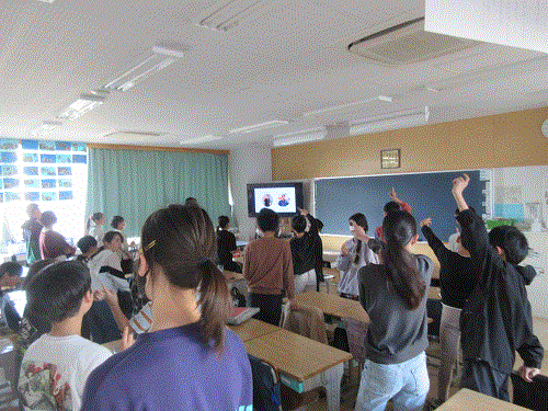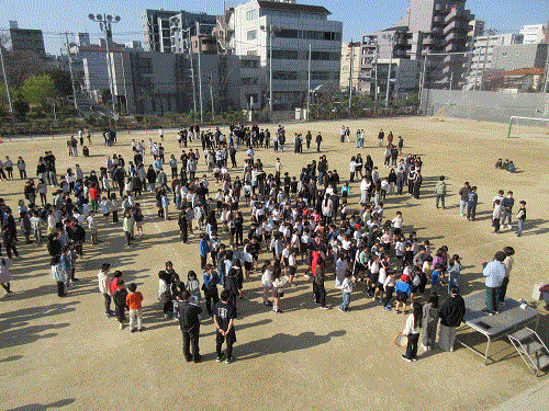 いつもは、3学年ずつ、体育館と教室(放送)で行いますが、この日は体育館が卒業式仕様になっていたことから、校庭と教室で行いました。
