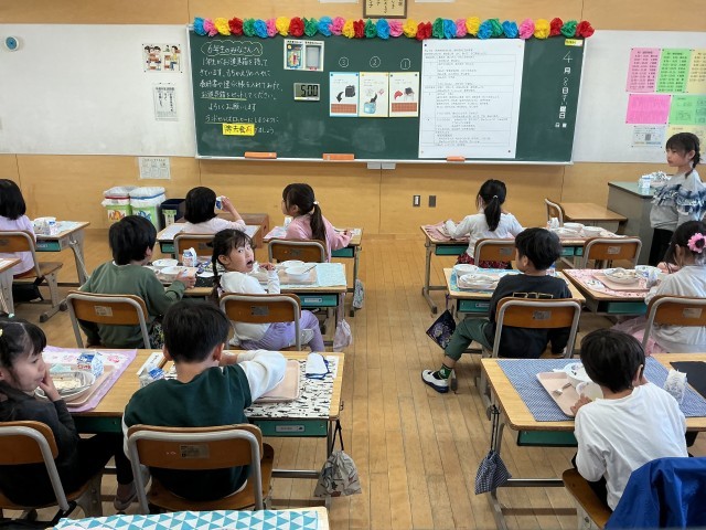 今日から1年生は、牛乳だけではなく、2年生以上の子どもたちと同じメニューを食べます。