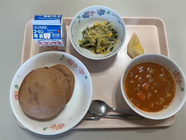 今日の献立は、ピンクのきなこビスキュイパン、ポークビーンズ、わかめサラダ、りんご、牛乳です。