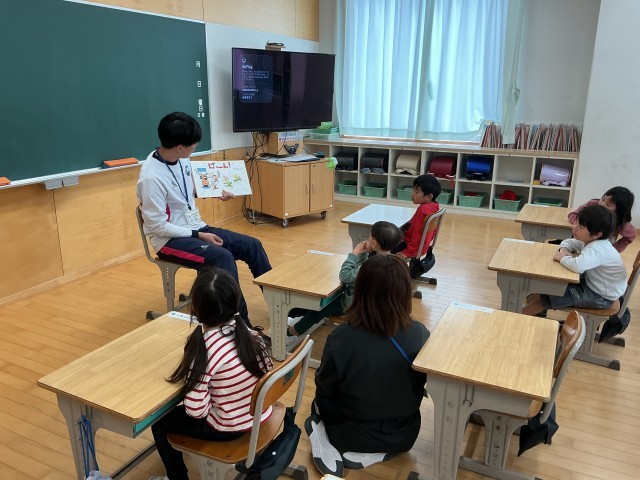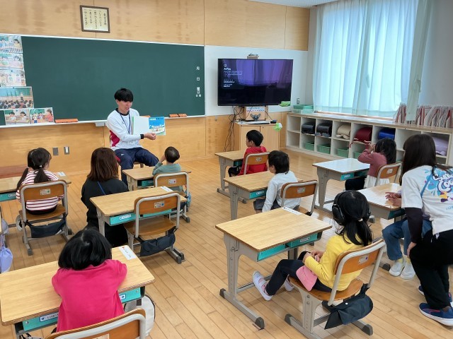 本の読み聞かせを行っています。先生の優しい口調で、お話が語られています。