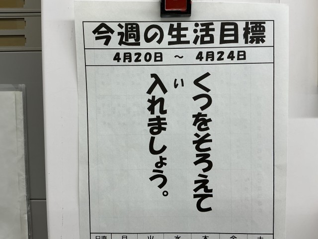 今週の生活目標は、「くつをそろえて入れましょう。」です。