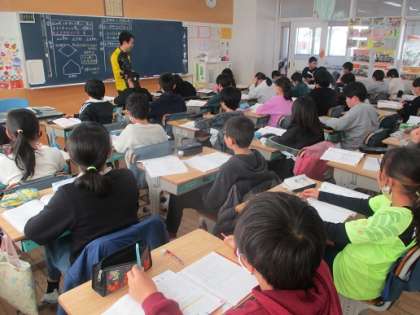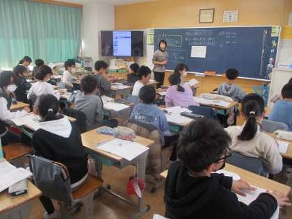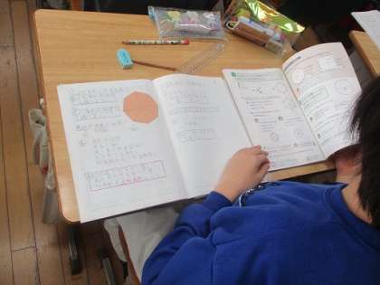 5年の算数は正八角形の学習。正八角形とはどういう形なのか。正三角形、正方形などをもとに辺や角に注目してその特徴を調べたり、何を使ってどのように描くことができるのかを考えたりしていました。
