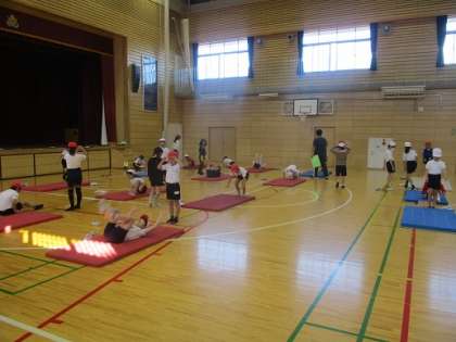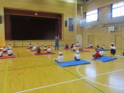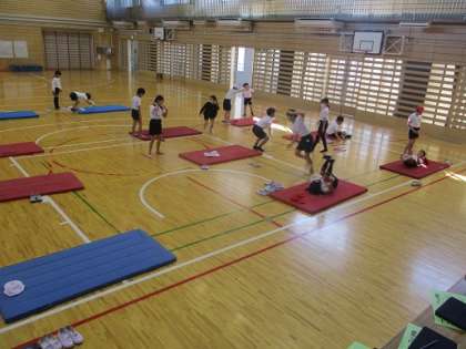 3年生の体育、マット運動。2人1組で1枚のマットを使います。前転などの技をお互いに見合ってアドバイスをしたり、映像で撮り合って自分の動きを確かめたり。協力しながら活動を進めていました。